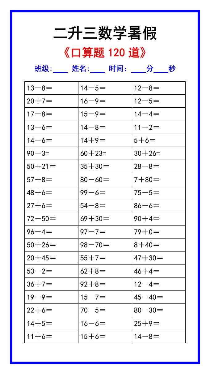 二升三数学暑假《口算练习题120道》汇总-三上数学