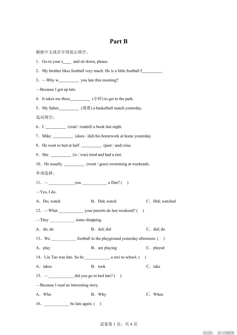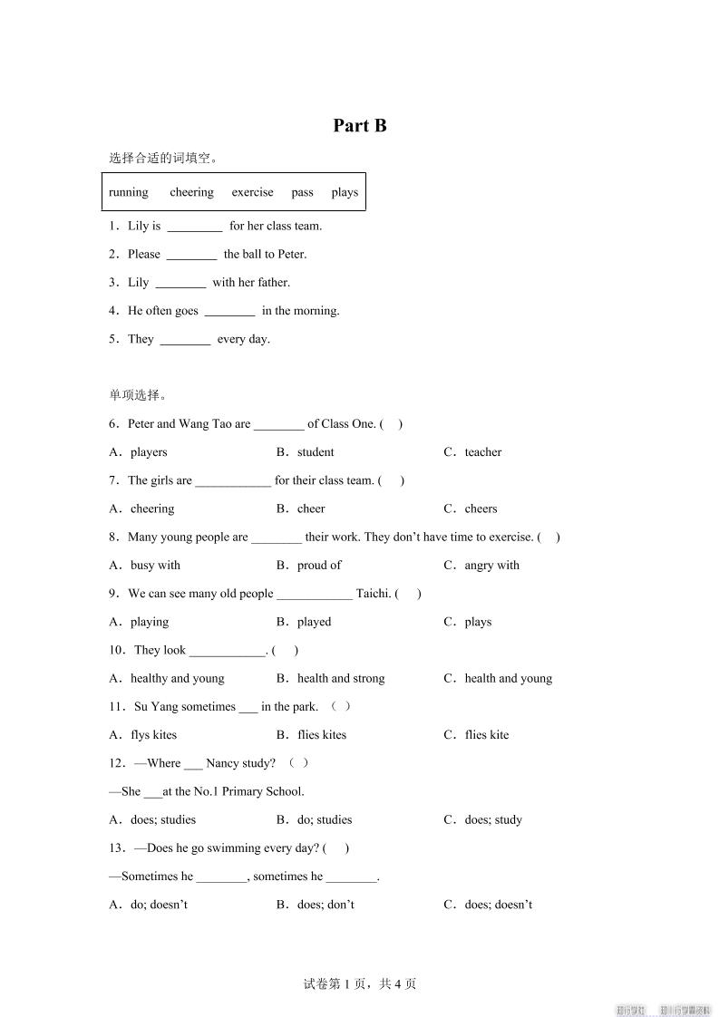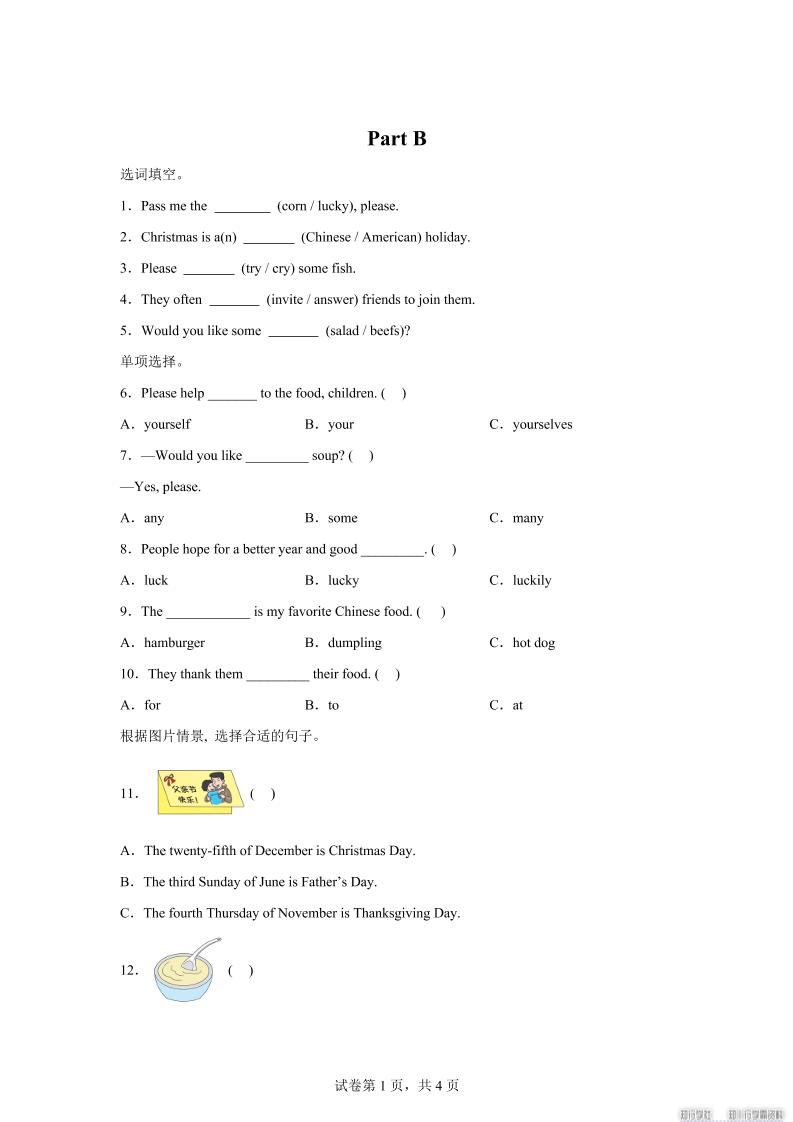 闽教版英语六年级上册Unit4PartB练习卷